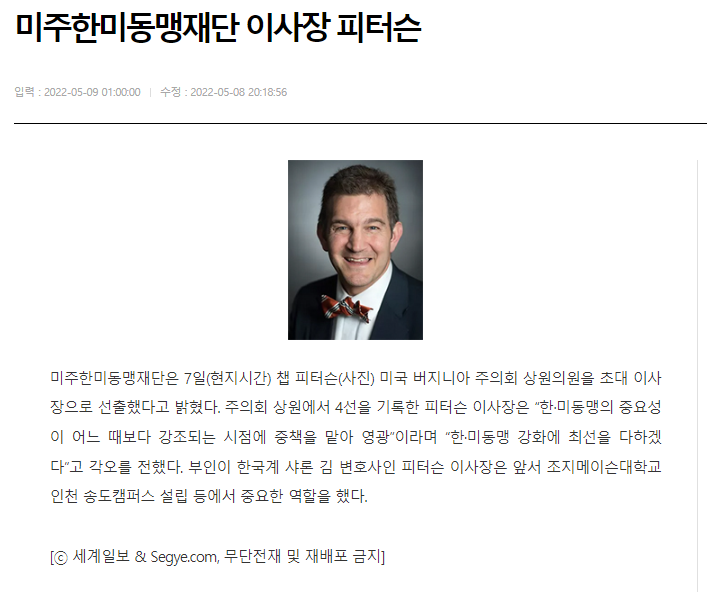 주의회 상원에서 4선을 기록한 피터슨 이사장은 “한·미동맹의 중요성이 어느 때보다 강조되는 시점에 중책을 맡아 영광”이라며 “한·미동맹 강화에 최선을 다하겠다”고 각오를 전했다.