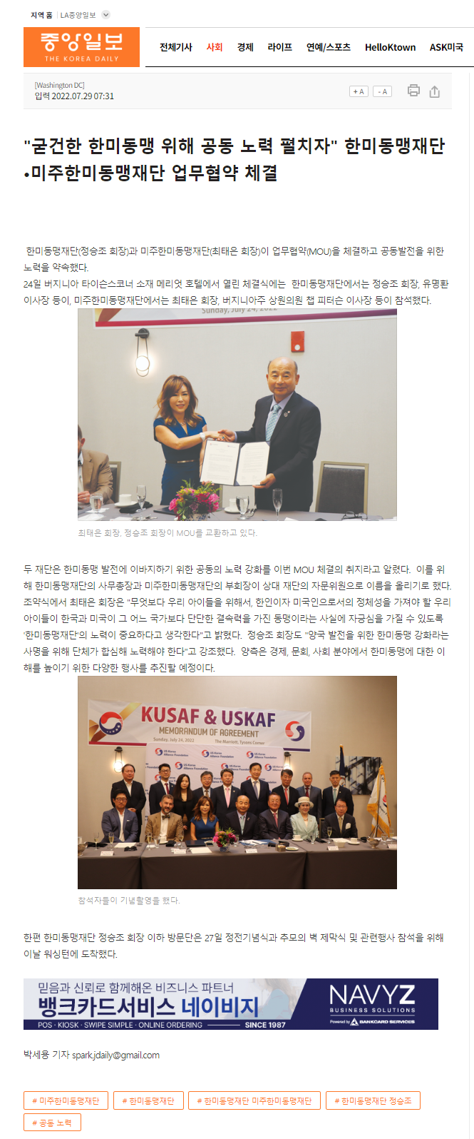 한미동맹재단(정승조 회장)과 미주한미동맹재단(최태은 회장)이 업무협약(MOU)을 체결하고 공동발전을 위한 노력을 약속했다.