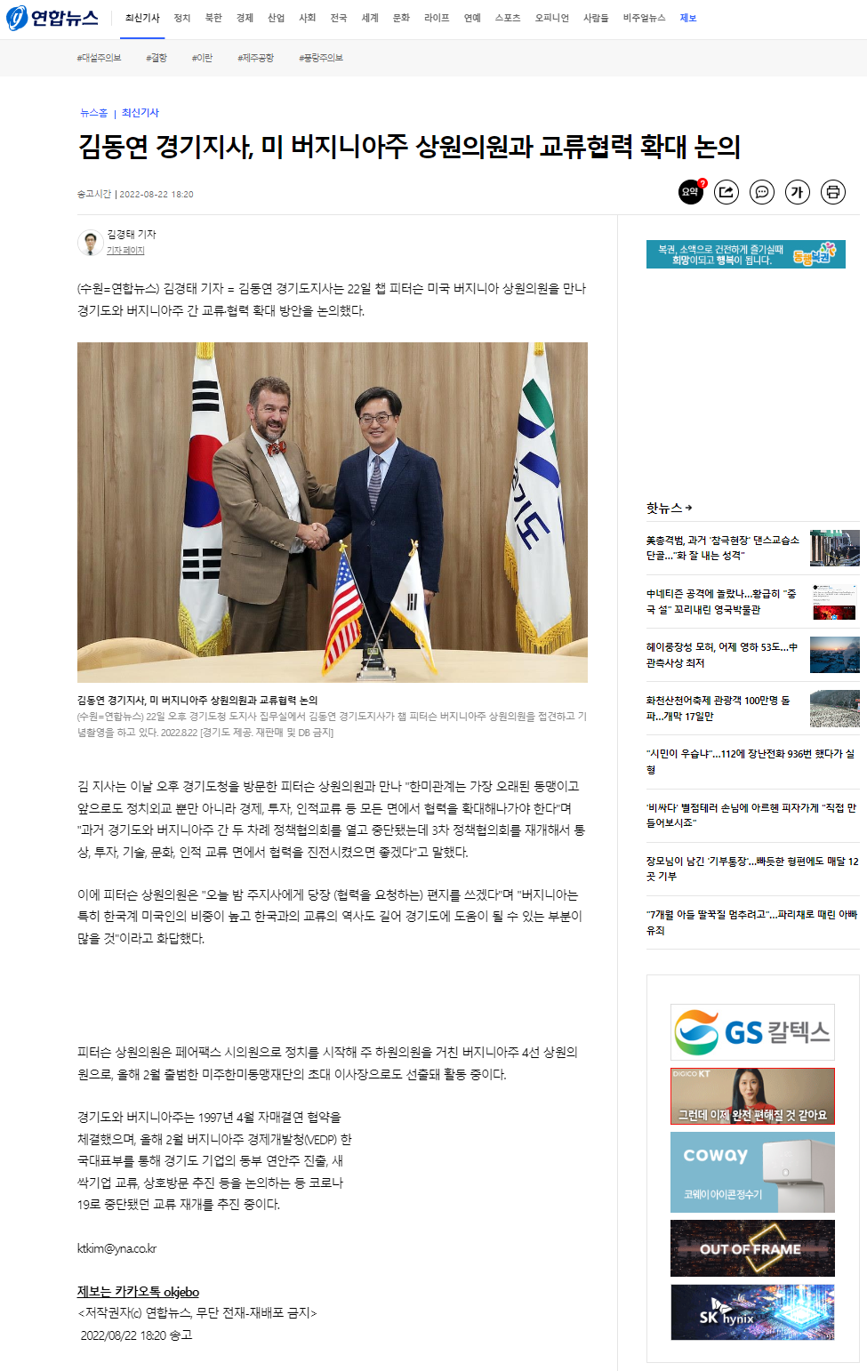 김동연 경기지사, 미 버지니아주 상원의원과 교류협력 확대 논의