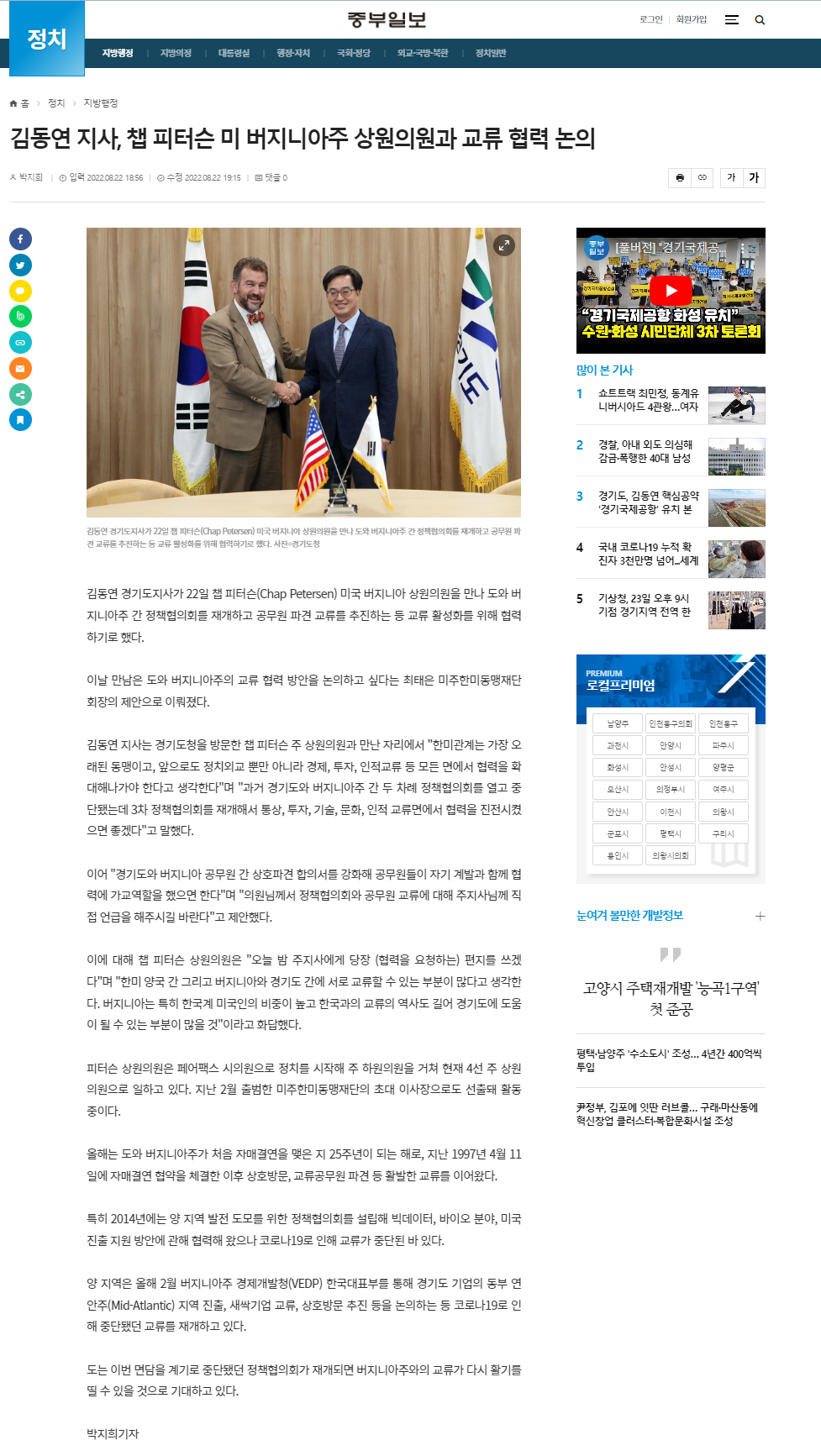 - next김동연 지사, 챕 피터슨 미 버지니아주 상원의원 접견 23.01.24
