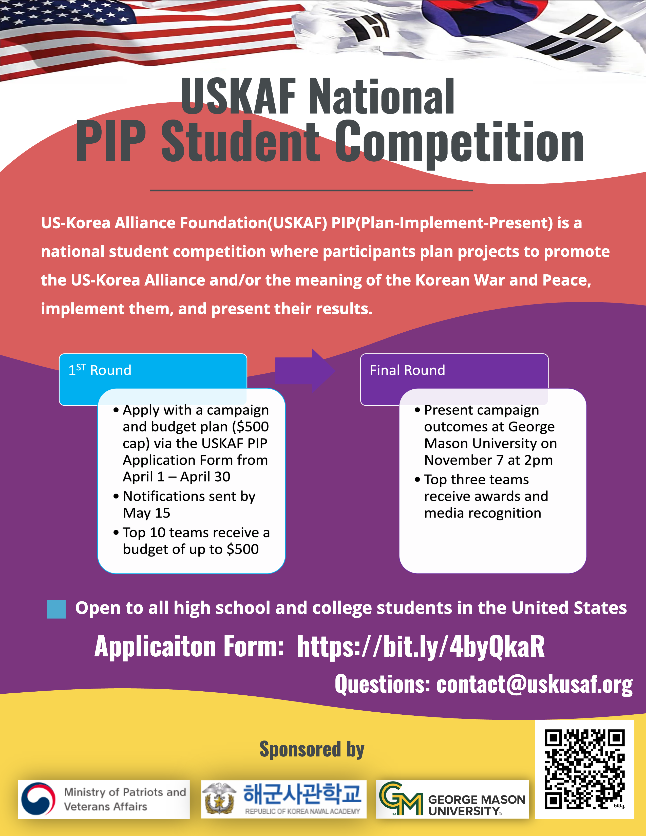 USKAF PIP (Plan-Implement-Present) is a national student competition that the participants plan their projects to promote the US-Korea Alliance and/or the meaning of the Korean War and Peace, implement them, and present the results. Their projects shall be supported by USKAF by providing budgets and the participants to be awarded accordingly.
